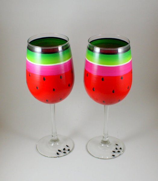 Für diese schicken Wassermelonen-Gläser verwendest du am besten Glasfarbe. Trage sie mit einem flachen Pinsel auf. Tupfe zum Schluss ein paar Kerne mit einem Marker auf.