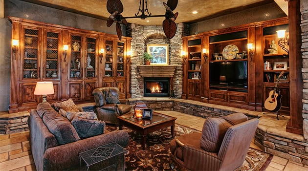 Charmant ist auch diese unserer Wohnzimmer Interieur-Ideen. Die Kombination aus Naturstein und dunklen Echtholzmöbeln versprüht echtes Landhaus-Flair! Zu den rauen Platten aus Naturstein passen grobe dicke Stoffe und bequeme Sessel. Dekoelemente aus Gusseisen dürfen hier wirklich nicht fehlen.